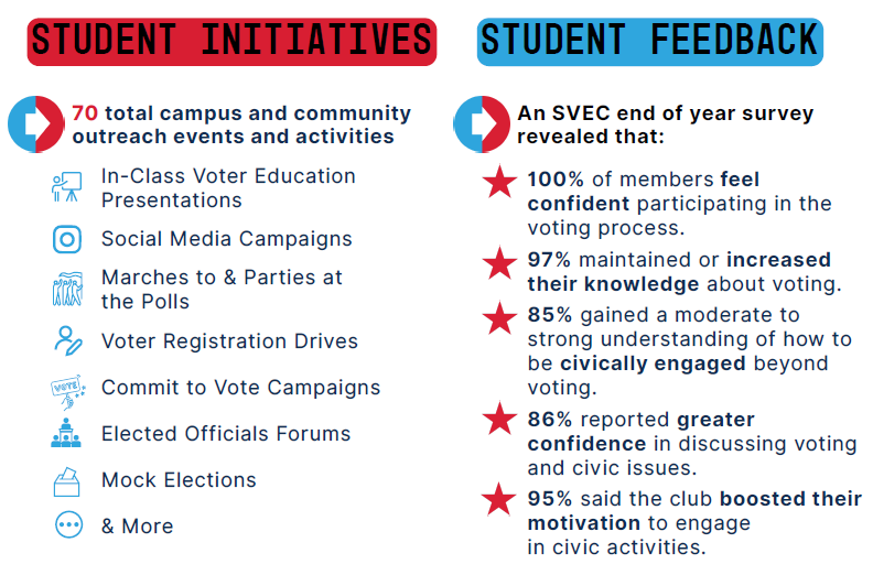 What are Student Voter Empowerment Clubs? A program of March to the Polls, the Student Voter Empowerment Clubs (SVEC) are campus student-led, non-partisan groups focused on making civic engagement fun. Open to grades 9-12, SVEC promotes civics education and participation through dynamic year-round, peer-to-peer outreach activities and hands on learning experiences. With clubs in Dallas and Tarrant counties, some of the student-led activities include candidate forums, town halls, voter registration drives, meetings with elected officials, voting-themed contests, and field trips to legislative and governmental meetings.